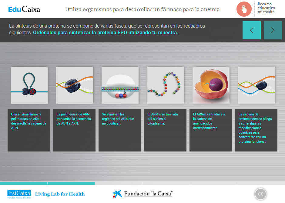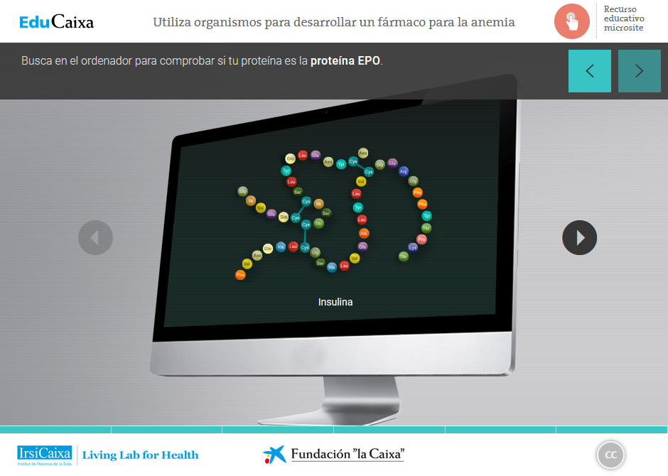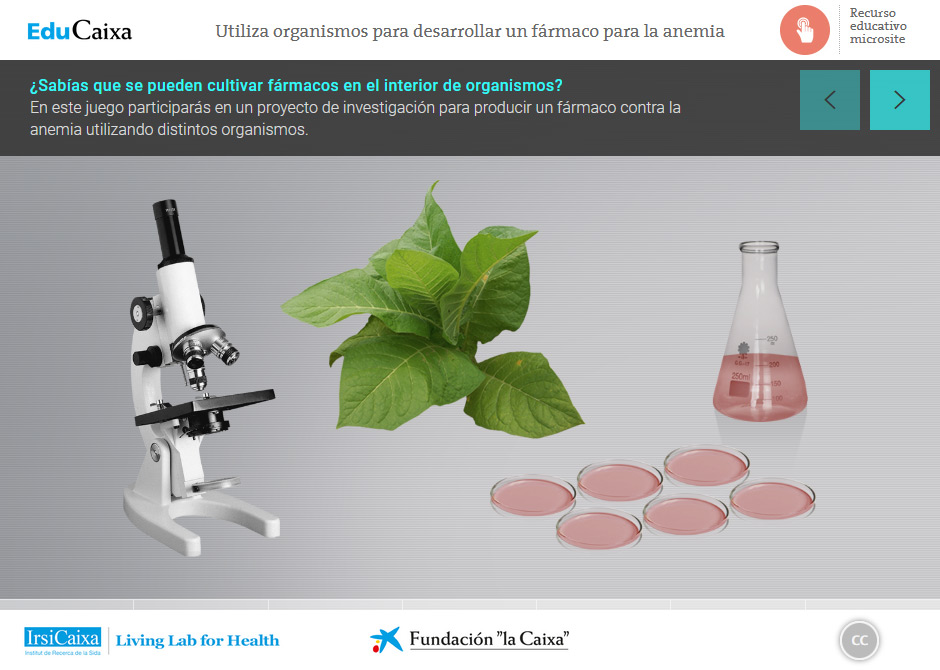 Diseño y programación en html5 del recurso interactivo «Utiliza organismos para desarrollar un fármaco para la anemia», sobre investigación científica para el portal EduCaixa.